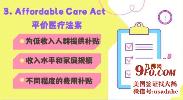 3. Affordable Care Act(ACA)(平价医疗法案):ACA提供了在医保市场上购买保险的机会,并为符合条件的低收入人群提供补贴。根据收入水平和家庭规模的不同,可以获得不同程度的费用补贴。