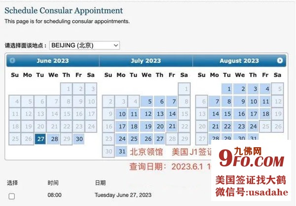 预约J1签证查询结果:目前系统显示北京领馆J1签证预约最早有2023年6月27日。
