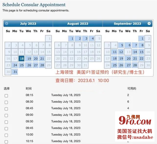 上海领馆:美国F1签证(研/博):2023年7月18日