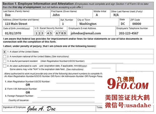 上面这张截图是美国签证找大鹤查到的移民局在官网给出的雇员部分的填写示例,在员工个人资料栏中,除了社安号SSN、电话号码、电子邮件、家庭住址等基本信息外,雇员必须提供自己在美国的移民身份,包括公民、绿卡、工作签证等。