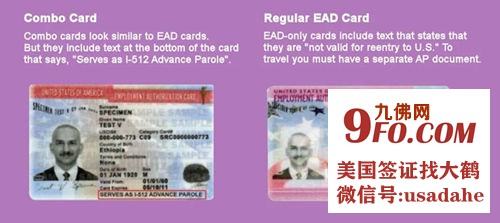 所谓Combo卡,指的是这张卡同时有两个功能,即Advance Parole(回美证)和EAD(工卡),它跟常规EAD卡的区别在于下方有一行字:Serves as I-512 Advance Parole(本卡同时用作Advance Parole用途),见下面的示例图片: