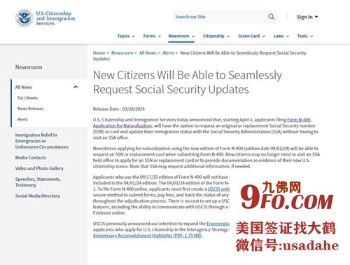美国公民和移民服务局宣布一项新服务,4月1日起入籍时可同步申请/更新社安号。