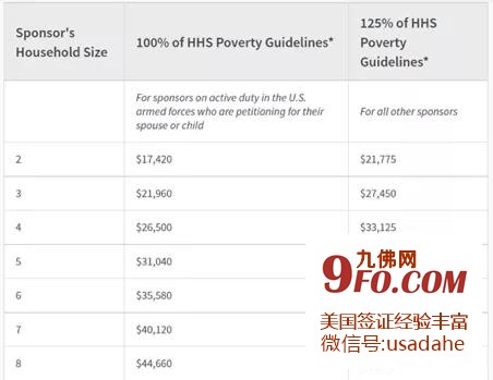 表格最左边一栏是家庭成员的数量,计算方法是申请人自己加上被申请人的人数。中间一栏针对的是军队现役人员,不适用于一般申请人。最右边一栏就是125%的联邦贫困线标准。例如,一位美国公民申请父母移民,那么家庭成员数量就是3人。根据表格最右边一栏,这位申请人的收入需要达到每年$27,450及以上才够标准。